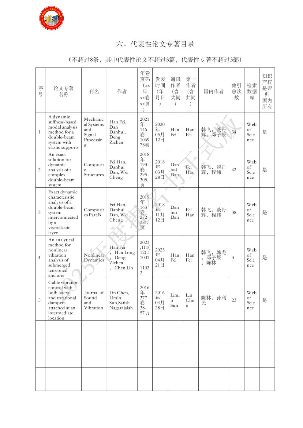 排名:1 行政职务:无 技术职称:副教授 工作单位:西北工业大学 完成项目时所在单位:西北工业大学 对本项目主要学术贡献:对发现点1、2、3做出了创新性贡献,具体包括:提出 “张紧弦 + 欧拉梁” 物理模型,揭示应力刚化效应机理,攻克 “模态硬化” 缺陷,发现拉氏域特征值方程一致性规律,建立耗散系统保物理动刚度理论;提出 “频域力 - 形动态自洽” 保能量思想,开发 “自检验、自纠偏” 方法,攻克 “特征值漂移” 问题,大幅提升计算效率与精度。并为索缆参数识别优化目标函数的设计提供动刚度理论支撑,协助确定多参数同步识别的核心逻辑。(代表性论文1、2、3、4)