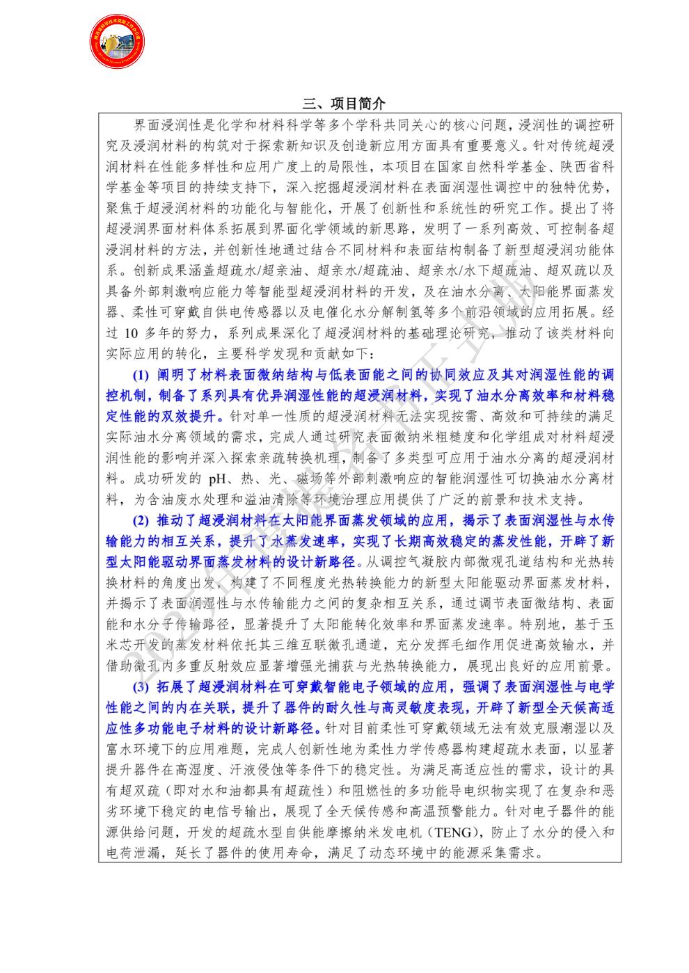 | 提名单位意见: | 该成果围绕界面浸润性调控这一化学与材料科学领域的核心科学问题,针对传统超浸润材料在功能多样性和应用适应性方面的不足,在国家及省级科学基金的长期支持下,系统开展了超浸润材料的功能化与智能化研究。项目提出了将超浸润体系拓展至界面化学新范畴的研究思路,发展了一系列高效、可控的材料制备新方法,创新构建了多种具有智能响应能力的超浸润功能体系,并成功应用于油水分离、清洁能源、智能电子等前沿领域,取得了多项原创性、系统性的重要突破。主要创新包括: