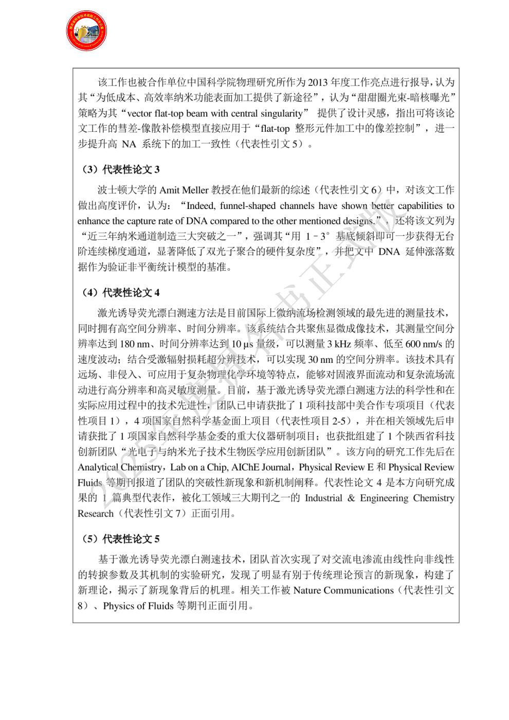排名:6 行政职务:无 技术职称:教授 工作单位:西北大学 完成项目时所在单位:西北大学 对本项目主要学术贡献:在本项目中承担光学光路的设计、研究论文的修改等工作,具体贡献:(1)远场光学超分辨制造技术的光学系统设计;(2)单光子激光加工系统的设计,并利用该系统制备最小直径48 nm 的纳米结构;(3)参与代表性论文2、4、5的撰写修改。