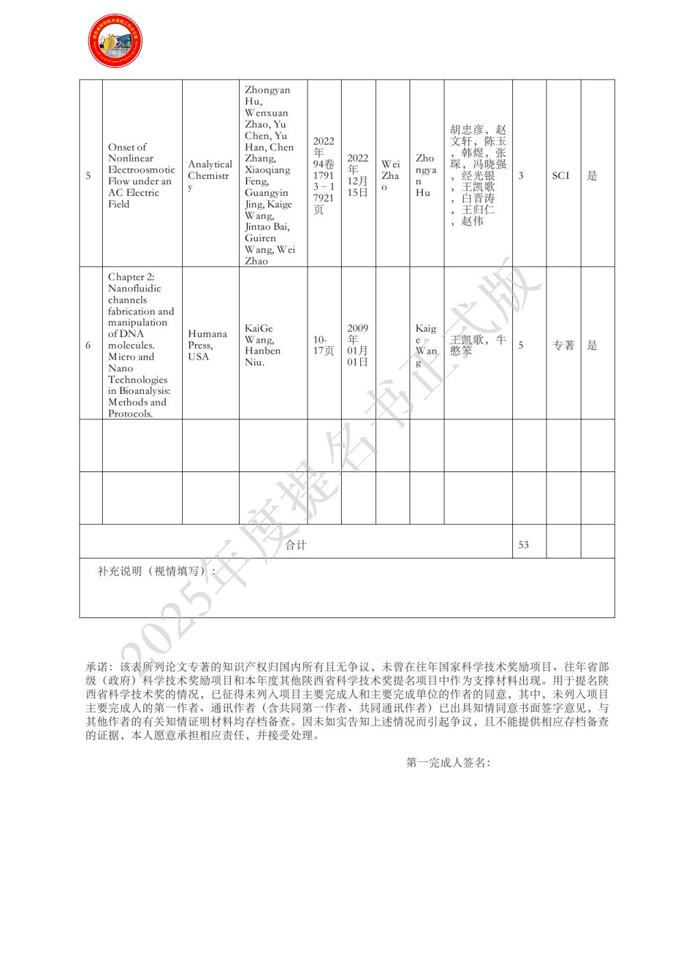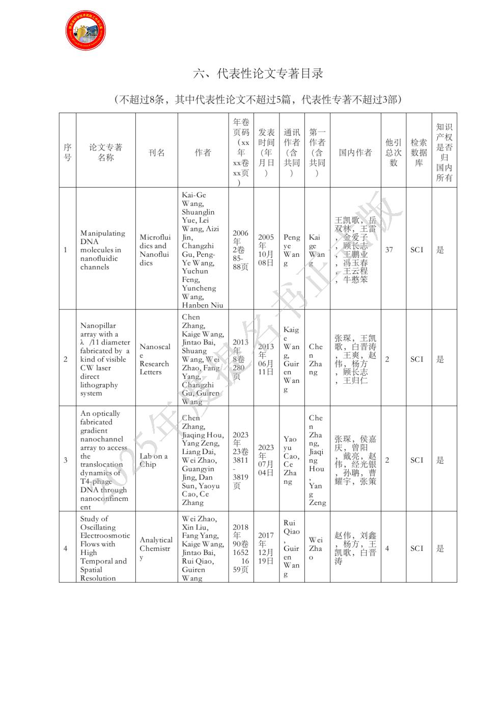 排名:1 行政职务:无 技术职称:研究员 工作单位:西北大学 完成项目时所在单位:西北大学 对本项目主要学术贡献:全面负责,包括项目统筹规划、人员组织、基金申报、方案制定、结果分析等。具体贡献:(1)国内率先利用FIB技术研制纳米孔/通道,集成分子芯片实验室,研究DNA穿越纳米通道特性,发展了一种范式研究方法;(2)提出并带领团队基于连续激光实现了尺寸<50nm的纳米柱、纳米孔道,突破了阿贝衍射极限的限制;(3)首次实验发现了DNA分子穿越微纳米通道时运动方向的反转、旋转现象,在单分子层面阐明了运动机制。(4)带领团队研建了一套具有超分辨成像、功能纳米结构制造、微纳流体流速测量的远场光学超分辨成像综合分析系统,空间分辨率<30nm。(5)代表性论文1、2、4、5和专著的撰写。(6)项目1-4申请与管理。