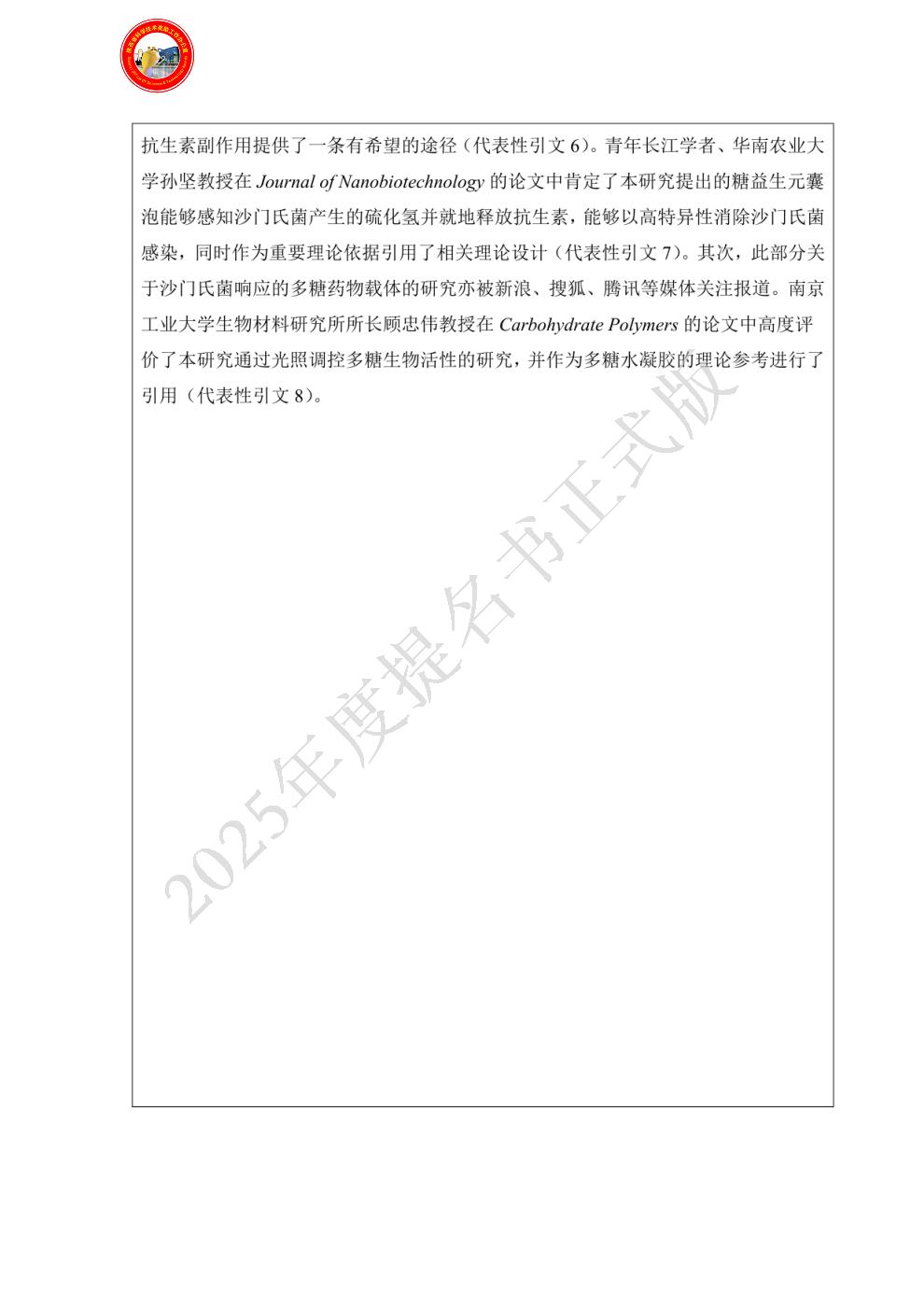 | 提名单位意见: | 该项目契合国家"面向人民生命健康"科技战略导向,紧密围绕国家"应对细菌耐药性"和"创新药物递送系统"重大战略需求,在功能性糖质结构修饰与功能调控领域取得系统性原创成果。1揭示多糖老化修饰新机制:首次阐明糖胺聚糖去乙酰化修饰通过TLR2/MyD88途径弱化免疫应答(对比未修饰多糖的TLR4途径),并发现其吸湿保湿性能下降的分子基础为衰老相关生理现象提供理论解释。2首创多糖-抗生素协同抗感染策略:构建壳聚糖-链霉素复合物,首次通过共价修饰破坏革兰氏阳性菌生物被膜;开发透明质酸-抗生素靶向递送系统,经CD44受体增强胞内菌清除效率显著降低肾毒性。3开拓功能化多糖精准应用,设计微环境响应型多糖载体,实现抗生素靶向递送及肝素抗凝活性光控调节,推动多糖在药物递送领域革新。项目通过多学科交叉研究,不仅深化多糖结构-功能的理论认知,更为解决细菌耐药性、胞内菌感染治疗及药物精准递送等临床难题提供新思路。该项目聚焦行业前沿,为多糖物质在生物医药行业应用提供理论创新和机制解析,在Nature Communications、Glycobiology、Carbohydrate Polymers等顶级期刊和糖生物学类专业期刊发表相关论文35篇,多次应邀在本学科领域有重要影响的学术会议上作报告,被多国学者在系列国内外高影响力期刊文章就研究创新性和理论重要性等方面进行了高度评价,符合陕西省科学技术奖的奖励条件。