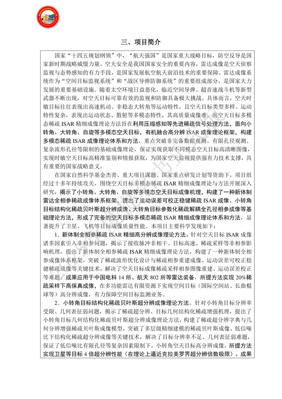 排名:1 行政职务:副院长 技术职称:教授 工作单位:西安电子科技大学 完成项目时所在单位:西安电子科技大学 对本项目主要学术贡献:作为项目负责人,整体把握项目的研究方向。针对空天目标多模态稀疏ISAR精细成像开展了系统深入研究,是代表性论著1-4、6-8的主要作者,对应重要科学发现1-3内容。