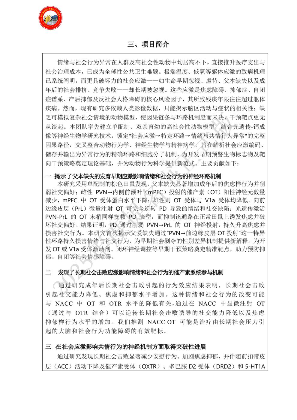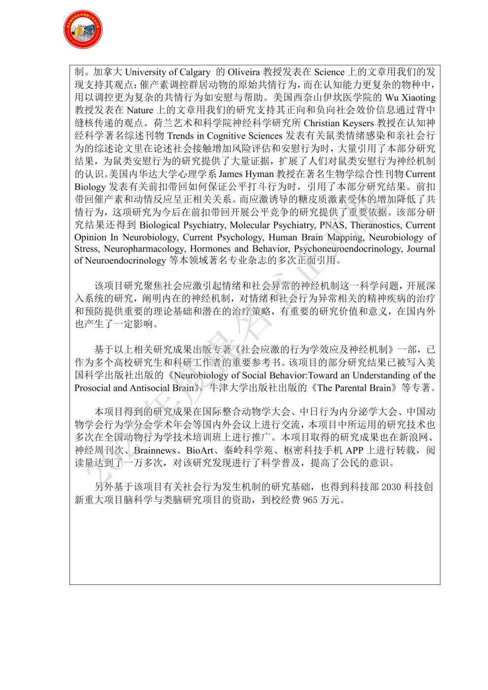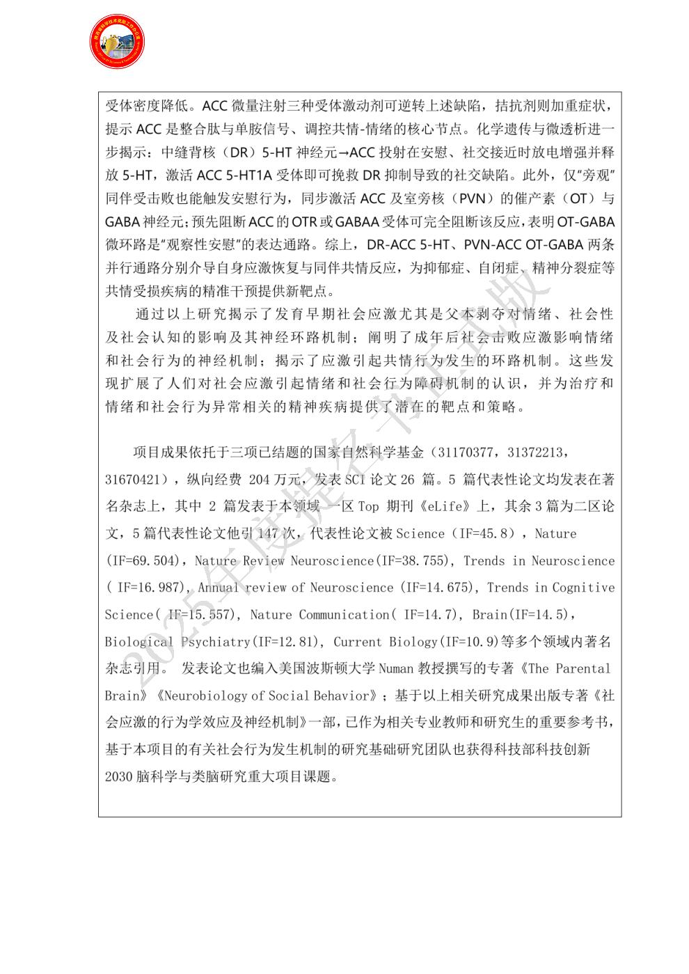 | 提名单位意见: | 情绪与社会行为障碍在人类及高社会性动物中呈高发态势,造成显著社会与经济负担。社会应激是诱发此类障碍的关键环境因子,但其介导的神经机制长期未明。“社会应激对情绪及社会行为的影响及其神经机制”项目以单配制、高社会性动物为模型,首次阐明早期父本缺失与成年应激通过特定神经环路及神经内分泌途径损害情绪调节并削弱共情行为的机制,拓展了社会应激致病的神经生物学认识。该成果已被国内外同行广泛引用并应用于精神疾病机制研究,为相关疾病的预防、诊断与干预奠定理论基础。