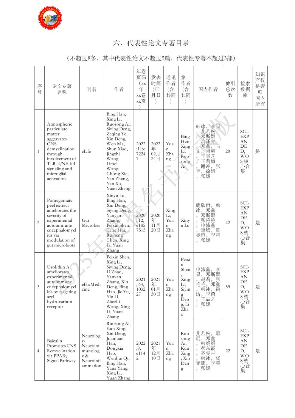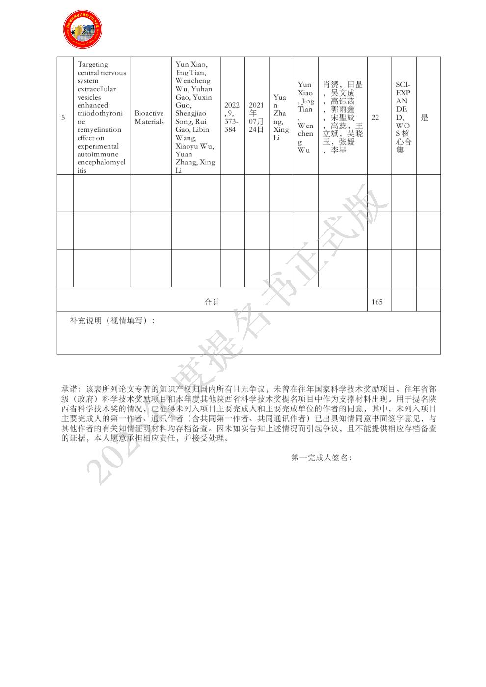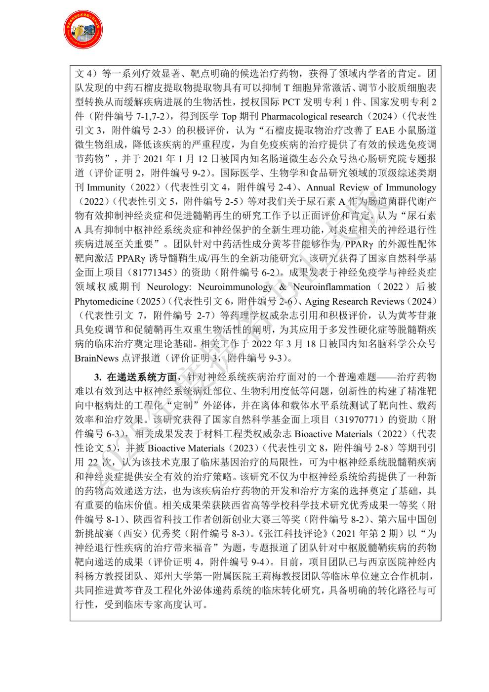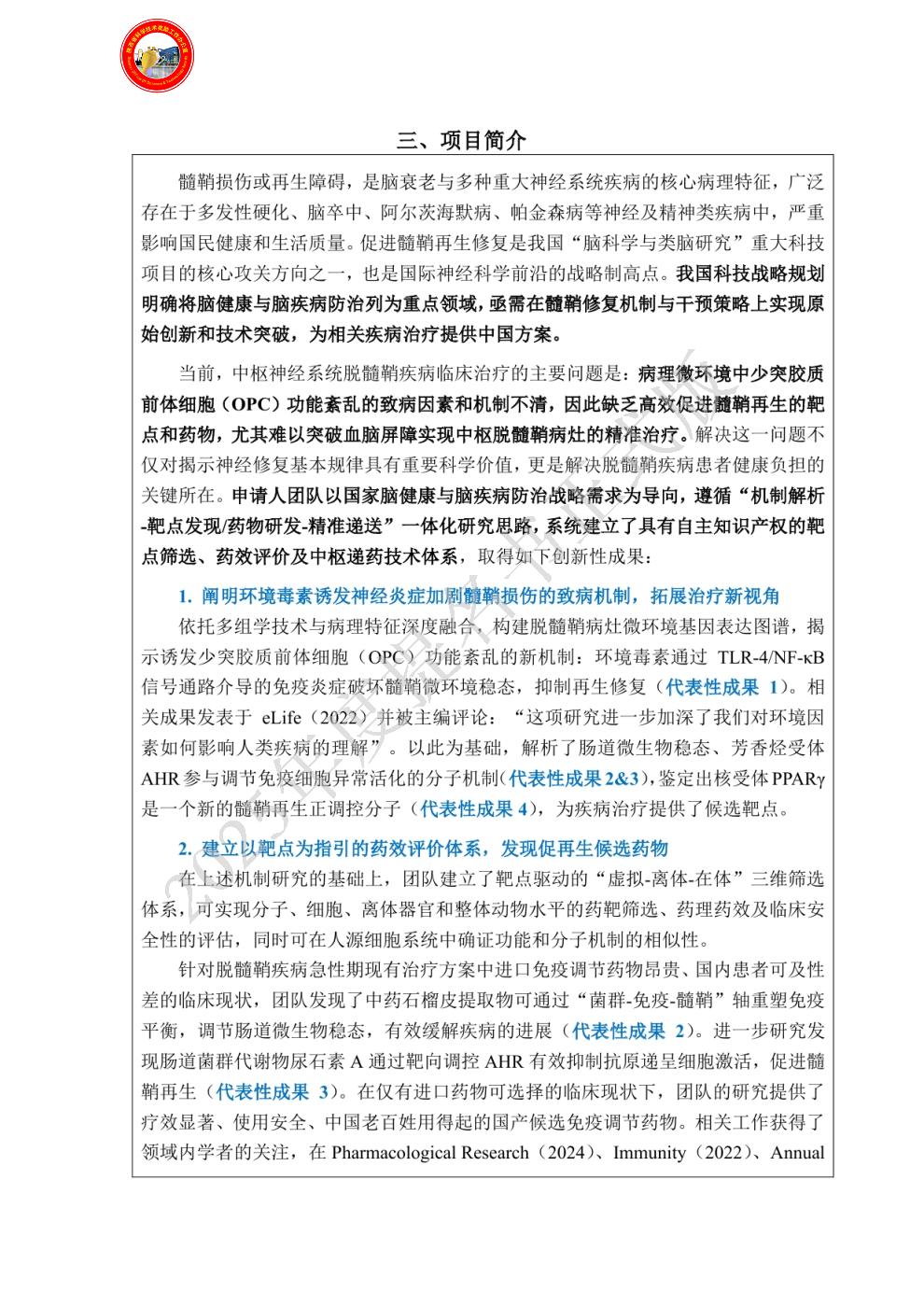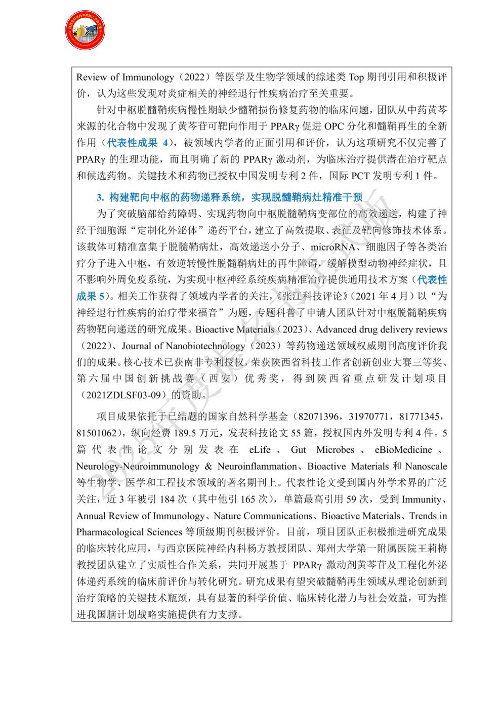 | 提名单位意见: | 该项目是在国家自然科学基金、陕西省重点研发计划、陕西省自然科学基金重点项目及陕西省创新人才推进计划等项目的资助下完成。针对中枢神经系统脱髓鞘疾病致病机制不清、治疗靶点缺乏、药物递送困难等关键科学问题,项目系统开展了从环境因素、分子机制到药物筛选与递送系统的多层次研究。