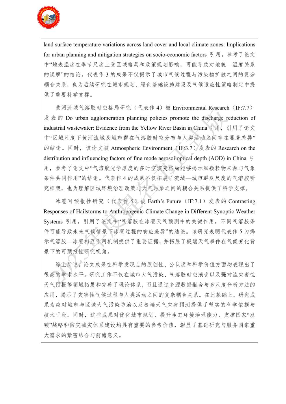 排名:6 行政职务:无 技术职称:无 工作单位:西北大学 完成项目时所在单位:西北大学 对本项目主要学术贡献:以第四作者身份参与了在国际知名期刊SCIENCE OF THE TOTAL ENVIRONMENT上发表论文(代表作3:Changes in air pollution, land surface temperature, and urban heat islands during the COVID-19 lockdown in three Chinese urban agglomerations),该期刊影响因子IF-9.8(2022年)。