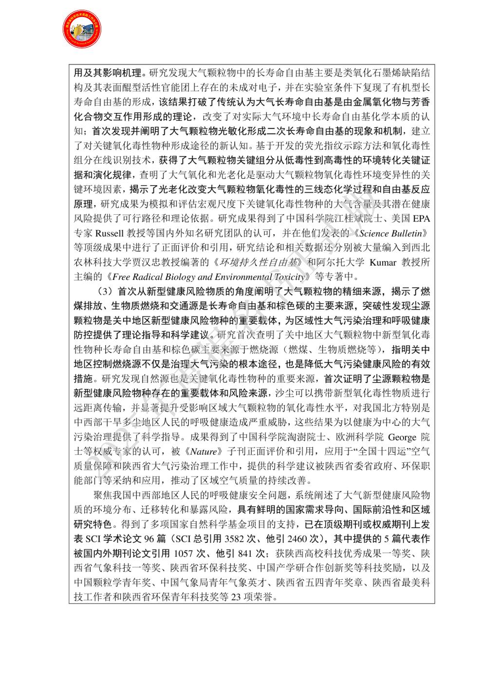 | 提名单位意见: | 该项目聚焦国家大气污染重点区域之一的关中平原,开展可吸入大气颗粒物中关键氧化毒性物质的识别方法、健康暴露风险及其污染来源研究。解决了从大气颗粒物复杂组分中识别出关键氧化毒性物质的技术难题,发现了新型健康风险物种——长寿命自由基和棕色碳对大气颗粒物氧化毒性的重要贡献,回答了大气颗粒物中关键氧化毒性组分是什么的科学问题,证实了煤炭和生物质等燃烧源是关中地区新型氧化毒性物种的主要来源,打破了以往新型氧化毒性物种必须由金属氧化物参与形成的认知,并突破性发现沙尘源是该地区新型氧化毒性物种的重要来源。研究成果实现了重要科学发现和基础理论创新,为空气污染导致人体健康危害提供了新的机制解释,并为区域性空气污染治理提供了理论支撑。