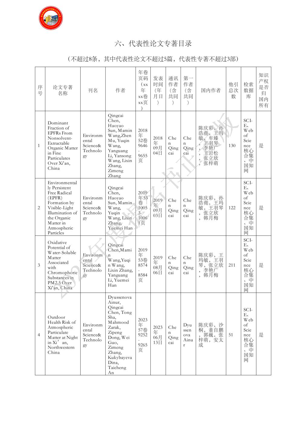 排名:1 行政职务:副院长 技术职称:教授 工作单位:陕西科技大学 完成项目时所在单位:陕西科技大学 对本项目主要学术贡献: 项目总负责人,负责整体研究方案的设计、项目工作统筹规划、实验资源调配等,开发创新方法和发现新型污染物(发现点1)、探究了化学原理和来源(发现点2、3),是第一、二、三篇代表论文的通讯作者和第一作者和第四篇代表论文的通讯作者(见附件1-4)。