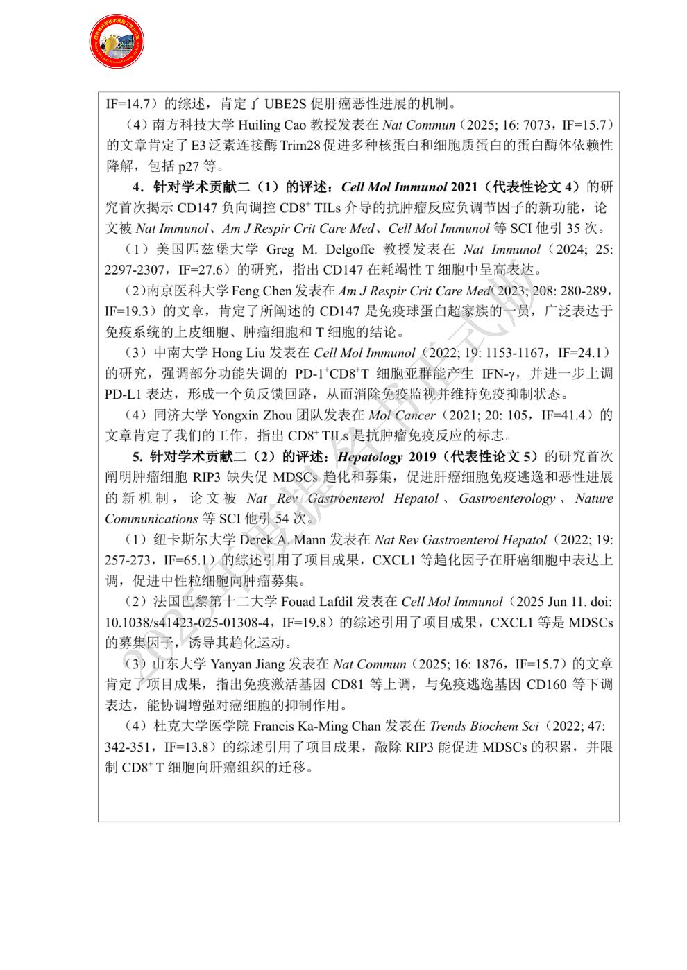 排名:4 行政职务:无 技术职称:副教授 工作单位:中国人民解放军空军军医大学 完成项目时所在单位:中国人民解放军空军军医大学 对本项目主要学术贡献:对“重要科学发现”第1项做出了创新性贡献,是代表性论文2、3的第一/共一作者。论文发表于Mol Cancer(IF=41.44)及Signal Transduct Target Ther(IF=38.10),对应证明材料见代表性论文专著附件2、3。