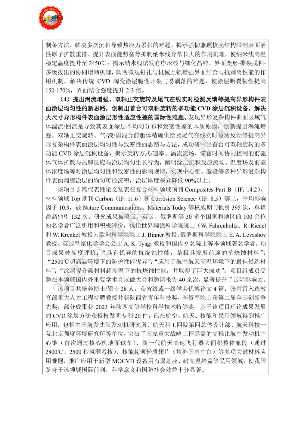 | 提名单位意见: | 该项目针对空天飞行器及其动力系统等国家重大战略工程对抗氧化/烧蚀碳/碳(C/C)复合材料提出的迫切需求,在多项国家自然科学基金(创新群体、重大仪器专项、重点、面上)等项目的支持下,瞄准C/C表面化学气相沉积(CVD)高温陶瓷涂层微结构调控与长寿命氧化/烧蚀防护机理,围绕涂层微结构调控机制、高阻氧-自愈合长寿命氧化/烧蚀防护机理、多层界面与陶瓷纳米线协同增韧机理等关键科学问题开展深入研究,阐明了陶瓷前驱体多级热解反应、异质/异构涂层生长与调控机制,提出了跨尺度增韧陶瓷涂层新策略,揭示了涂层多元协同长寿命氧化/烧蚀防护机理,创制出新型多功能CVD涂层沉积设备,攻克了大尺寸异形构件表面涂层均匀性差的难题,取得了具有重要科学意义和国际影响的原创性成果。该项目5篇代表作发表在复合材料领域顶刊Composites Part B、材料领域Top期刊Carbon和Corrosion Science等上,平均影响因子10.9,被Nature Communications、Materials Today等权威期刊他引395次,单篇最高他引132次,产生了重要的学术影响;授权发明专利20件,成果已在航空发动机中心锥、航天高速飞行器大面积整体舱段等得到应用,获2023年陕西高等学校科学技术特等奖。该项目材料齐全、规范,无知识产权纠纷,人员排序无争议,符合陕西省自然科学奖提名条件。 |