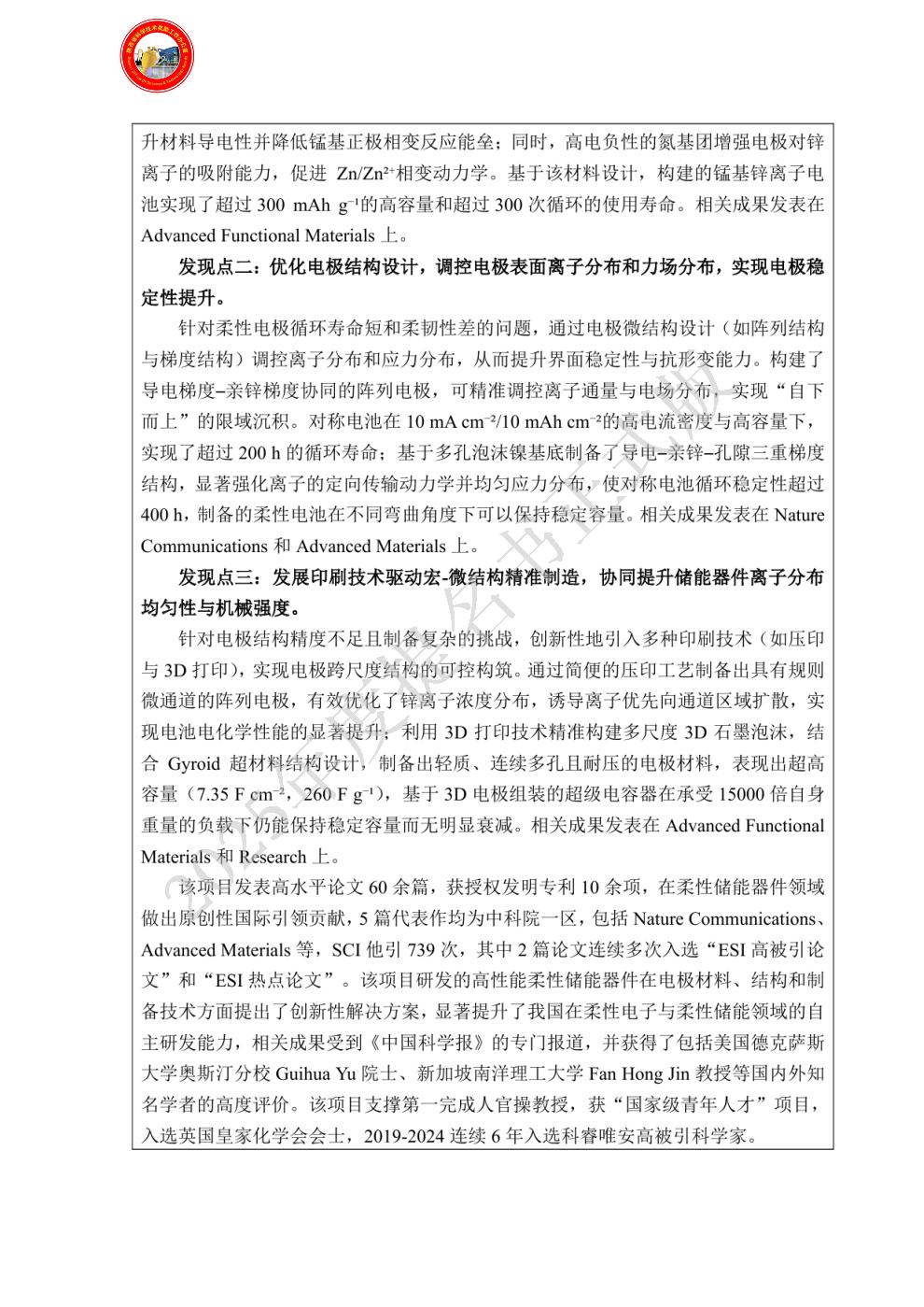 | 提名单位意见: | 该项目在解决当前柔性储能器件存在的容量低、循环寿命短和柔韧性差等关键科学难题,取得了一系列重要突破。该研究团队通过提出材料改性与结构设计相结合的策略,优化电极反应动力学、改善离子传输机制并提高力学稳定性,同时借助高效印刷技术实现精细结构的可控制造,成功开发出兼具高容量、长循环寿命和优异柔韧性的柔性储能器件。该项目研究成果选题准确,研究起点高,理论上有创新,在包括Nature Communications、Advanced Materials, Advanced Functional Materials等国际顶级期刊上发表SCI论文5篇,引用率高,受到国内外学术界的好评和认可,对相关研究有引领和示范作用,有重要的学术价值和理论意义。成果材料齐全、规范,无知识产权纠纷,人员排序无争议,符合陕西省自然科学奖提名条件。
