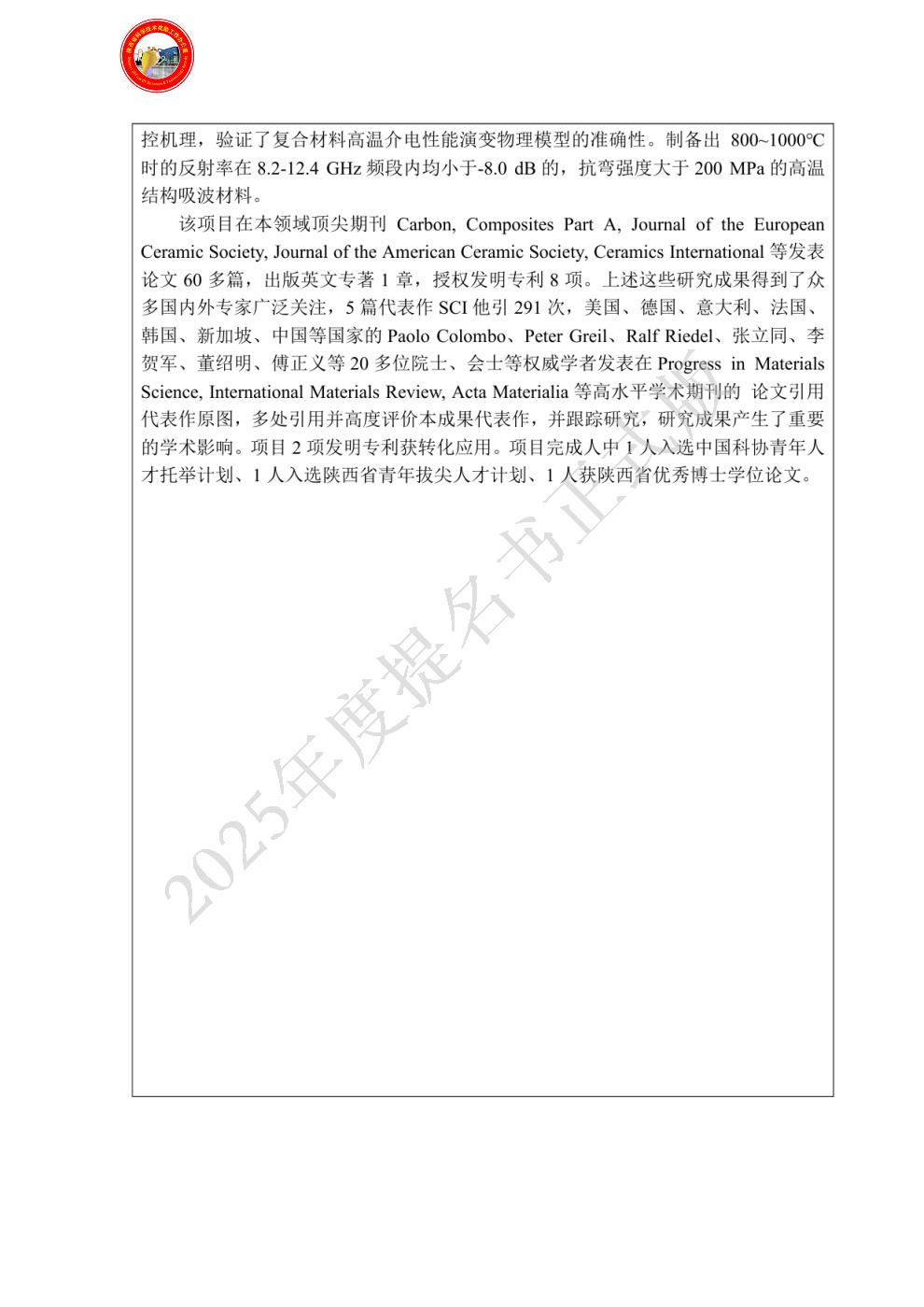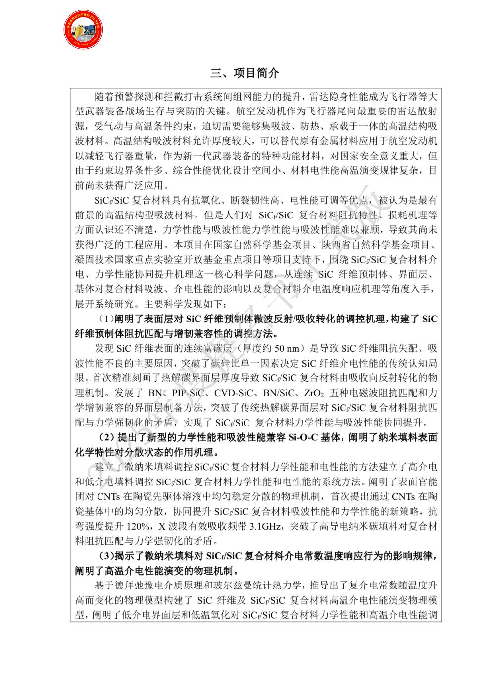 单位贡献:合作完成发现点1-3的主要工作,是完成人1、2的博士毕业单位。完成人在西北工业大学进行高温结构吸波材料的研究过程中,形成了发现点1-3的部分学术思想。西北工业大学为本项目实施所需要的实验设备、软硬件设置提供了充分保障,确保了项目的顺利实施,是典型的服务国家重大战略需求、解决国家卡脖子技术的研究型高校,为本项目人才培养提供了良好的平台。