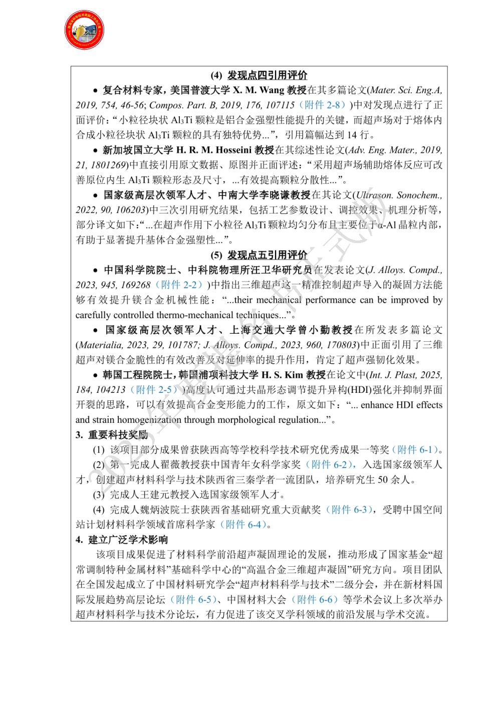 排名:5 行政职务:无 技术职称:无 工作单位:西安交通大学 完成项目时所在单位:西北工业大学 对本项目主要学术贡献:1. 对发现点1、5做出重要贡献,阐明了超声场与枝晶形核生长过程的交互作用机制,建立了镁合金的超声高效强韧化方法(附件1-1);