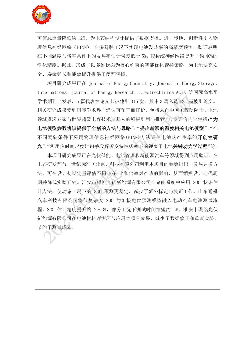 | 提名单位意见: | 该成果面向国家在新能源汽车与储能安全领域的重大需求,开展了锂离子电池多维状态估计与智能优化管控的系统研究,在电学状态高精度建模、热学状态机理揭示与预测、健康状态退化建模及寿命评估等方面取得了重要突破。研究发现了电池多维状态间的耦合规律,提出了物理机理与智能算法融合的统一建模方法,构建了兼具可解释性与工程适用性的状态估计框架,突破了电池内部不可测状态在线预测的瓶颈。成果设计了新型的热安全预警方法、能量优化调控策略与寿命预测模型,实现了热安全、能量管理与寿命延长的一体化管控。研究系统解决了复杂工况下电池状态估计精度不足、热风险预警滞后及寿命预测不稳定等难题,在新能源汽车与储能装备的电池管理系统(BMS)中具有重大应用价值。