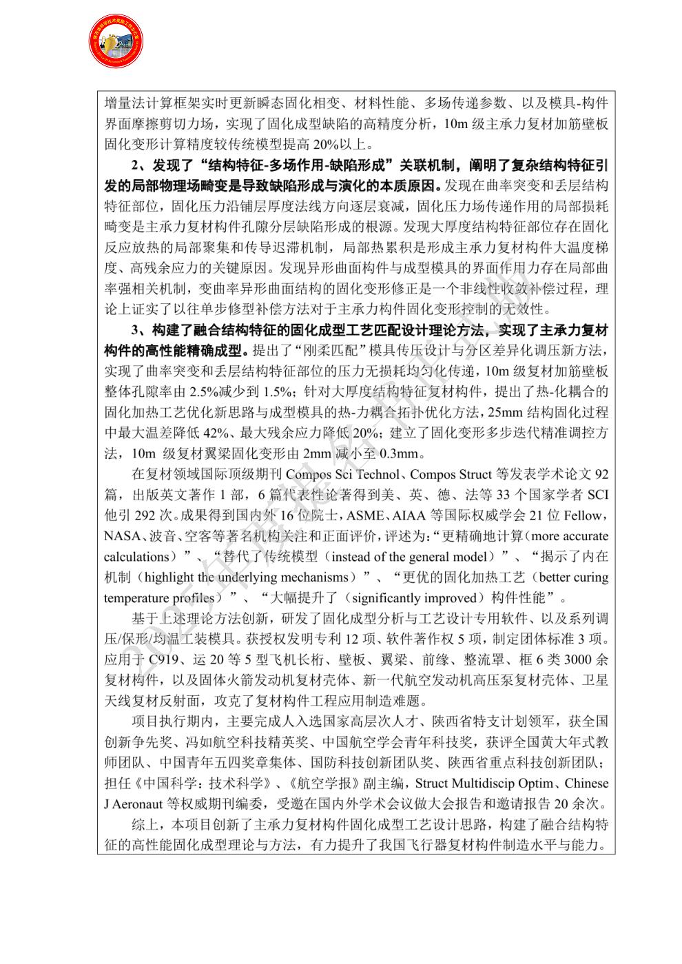单位贡献:西北工业大学全面负责本项目研究工作,主要贡献包括揭示了固化过程的多场耦合非均匀时空演化规律与模具-构件的热失配摩擦剪切效应,创立了固化成型高精度分析理论模型;揭示了结构特征与固化成型缺陷的内在关联机制;构建了融合结构特征的固化成型工艺匹配设计理论方法,实现了主承力复材构件的高性能精确成型;研发了固化成型分析与工艺设计成套软件和系列工装模具,开展了多个飞行器重大型号复材构件的高性能固化成型应用。