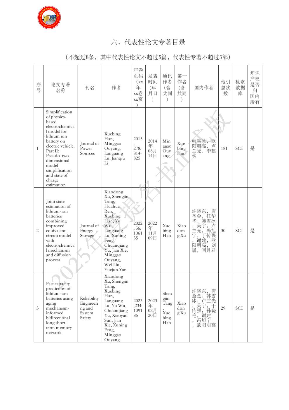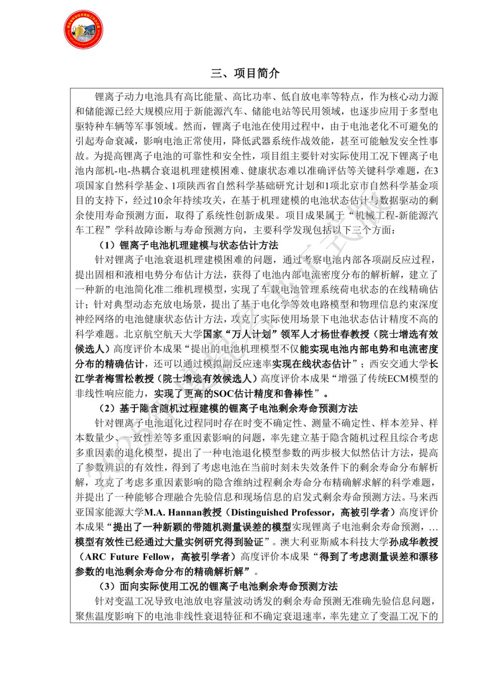 | 评审组: | 机械组 | | 项目名称: | 锂离子电池状态估计与剩余寿命预测方法及应用 |