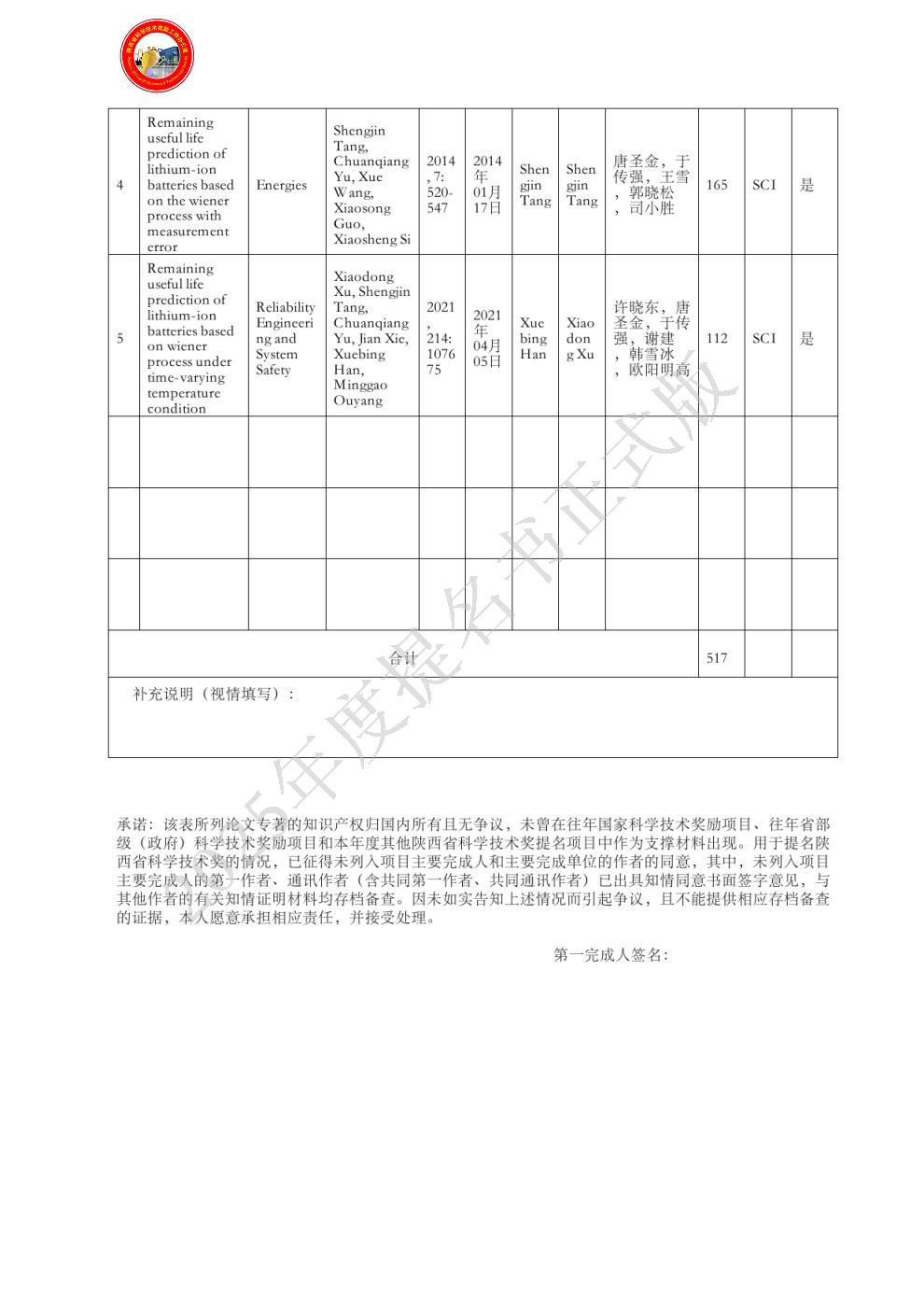 排名:1 行政职务:副总师 技术职称:副教授 工作单位:中国人民解放军火箭军工程大学 完成项目时所在单位:中国人民解放军火箭军工程大学 对本项目主要学术贡献:建立本成果总体理论框架,代表性论著4的第一作者,代表性论著2的第二作者兼共同通讯作者,代表性论著3、5的第二作者。主要创新性贡献为:1)针对锂离子电池退化过程同时存在时变不确定性、测量不确定性、样本差异、样本数量少、一致性差等多重因素影响的问题,建立了基于隐含随机过程且综合描述多重因素影响的退化模型,提出了一种锂离子电池退化模型参数极大似然估计的两步法,提高了参数辨识的有效性;2)攻克了考虑多重因素影响的隐含维纳过程剩余寿命分布精确解求解难题,得到了考虑锂离子电池在当前时刻未失效条件下的剩余寿命分布解析形式;3)推动了锂离子动力电池在国防领域多型特种车辆电池管理系统的应用。