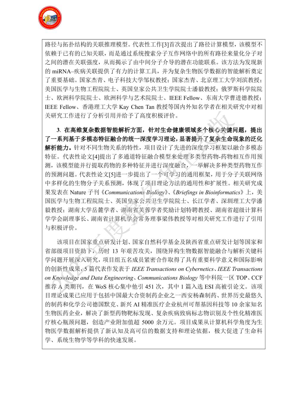 | 提名单位意见: | 该项目面向人民生命健康和人工智能国家重大战略需求,结合多源多尺度生物大数据精准解析的发展趋势,着力解决了异构生物数据跨模态融合建模、一致化精准表征、生物分子活动智能解析等核心挑战,在异构生物数据智能融合与解析的理论创新方面取得了系统性、原创性的成果。提出了多源异构生物数据的新型融合表示理论,构建了基于复杂网络与路径推理的关联解析新体系,揭示了“网络邻居”效应,为发现未知的生物分子功能联系提供了全新的计算视角。创立了面向多类任务的深度学习框架,显著提升了对复杂生物现象的泛化解析能力。研究成果对新药研发、疾病生物标志物发现、复杂疾病致病机理及生物学新机制阐明具有重要的科学价值和理论意义。研究成果得到了国内外学者的广泛引用和积极评价,推动了计算生物学与人工智能的交叉融合发展。该项目理论创新显著,方法体系先进,处于国际前沿水平,为生物医学大数据分析提供了重要的理论工具,对学科建设和经济社会发展有重要的指导作用。