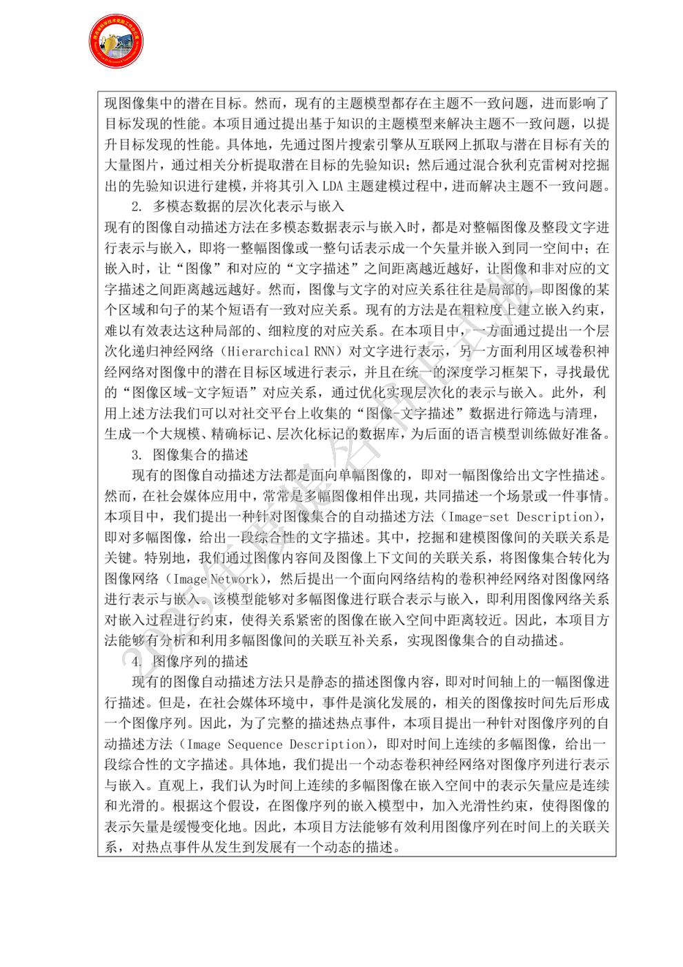 单位贡献:该项目面向社会媒体中的图像理解。由于社会媒体体量巨大、内容丰富、信息碎片问题严重、内容的演化速度快,因此社会媒体的内容分析是非常具有挑战性的。该项目主要任务是理解社交平台上图像的内容与高层语义,该项目研究社会媒体中的图像自动描述问题。具体说来,该项目在如下方向取得了五个科学发现:1)面向图像Graph的主题建模与图像表示;2)基于LDA-MDT主题模型的无监督图像目标发现;3)多模态层次化图像-文本联合表示与检索;4)面向Long-tail的多模态图文检索;5)基于深度学的排序回归与人脸年龄识别。