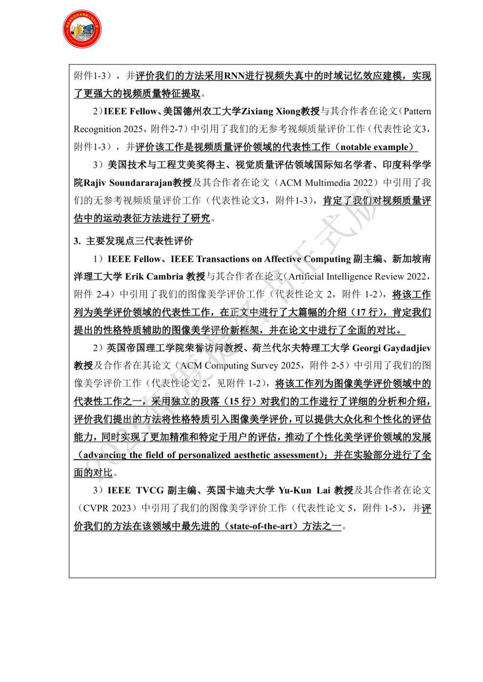 单位贡献:西安电子科技大学作为本项目第一完成单位,从项目立项、实施到技术路线研究都起主导作用,规划、设计和实施了本项目提出的基于共享知识表征的无参考图像质量评估方法、基于运动响应特性的视频质量评价方法和性格特质引导的图像美学评价模型。是本项目中创新点1、2、3的创造性贡献者,是本项目代表性论文1、3的第一完成单位。