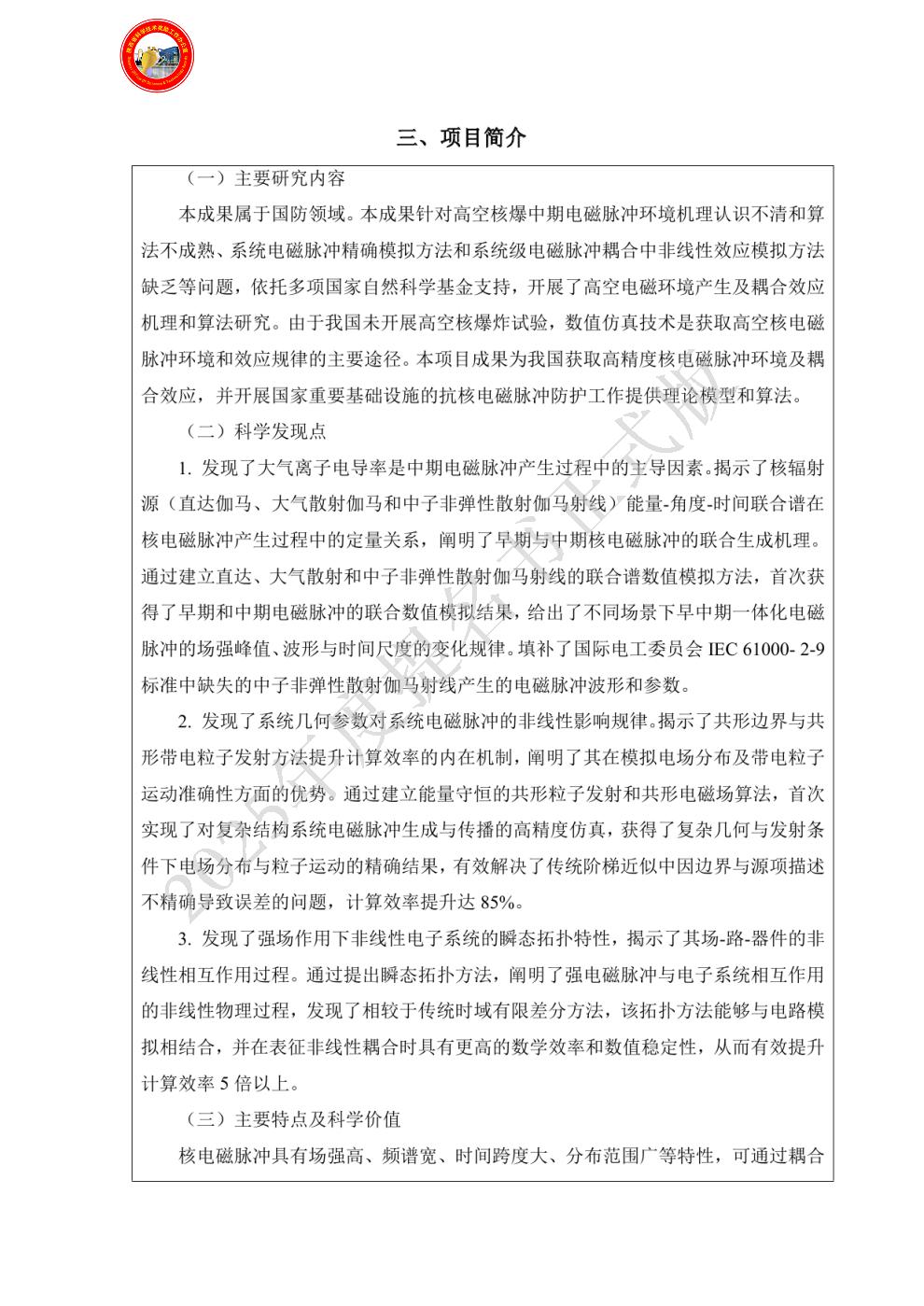 排名:3 行政职务:无 技术职称:副研究员 工作单位:西北核技术研究所 完成项目时所在单位:西北核技术研究所 对本项目主要学术贡献:参与了系统电磁脉冲数值模拟技术研究,研制了三维共形电磁场计算模块及带电粒子共形发射计算模块,并在超算上验证了程序的正确性。