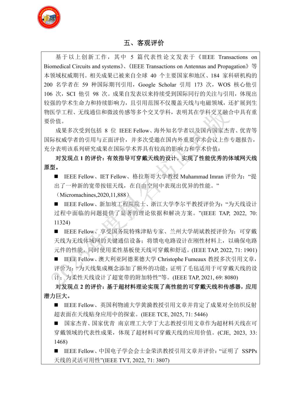 | 提名单位意见: | 体域网是新一代信息技术的重要组成部分,在医疗健康监测、智能穿戴和军事通信等关系国计民生与国家安全的领域展现出广阔前景。作为体域网高效通信的核心器件,可穿戴天线直接决定了系统的稳定性与可靠性,但其性能设计与优化仍面临多重挑战。
