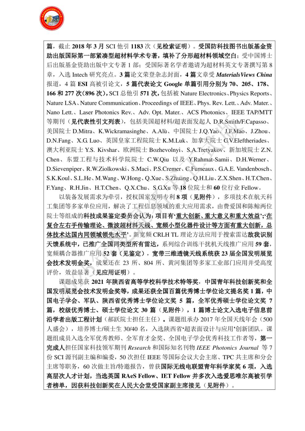 | 提名单位意见: | 项目针对微波/射频超材料的非均一性等科学问题以及装备工程应用重大需求,将分形几何与超材料相结合提出了分形超材料思想,区别于国内外其他超材料研究,围绕它的理论方法、设计原理、奇异特性与工程应用等核心问题展开系统研究。项目在国家自然科学基金项目等7项课题资助下,发现了分形、螺旋超材料的小型化机制、强手征性与高解耦效率以及双零阶谐振、双传输零点、全向频扫奇异辐射等新物理现象,突破了传统器件、天线的带宽和功能限制,开发了系列宽频馈线、天线、新功能器件、透镜与幻觉隐身套。项目在天线领域顶级刊物IEEE Trans. Antennas Propag(26篇)、Adv. Opt. Mater.等领域核心刊物发表SCI论文132篇,受到美国超材料/超表面发起人、院士和60余位行业Fellow的正面评价。科技成果鉴定委员会鉴定项目有‘重大创新、重大意义和重大效益,总体技术达国内同领域领先水平’。获陕西高等学校科学技术特等奖,全国发明展览会技术发明金奖,中国青少年科技创新奖,全国百篇、行业学会、军队、陕西省优秀博士、硕士学位论文奖12篇。成果材料齐全、规范,无知识产权纠纷,人员排序无争议,符合陕西省自然科学奖提名条件。