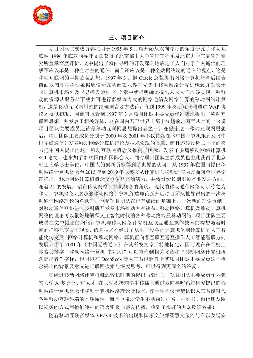 排名:1 行政职务:无 技术职称:讲师 工作单位:延安大学 完成项目时所在单位:延安大学 对本项目主要学术贡献:对本项目《重要科学发现》的4项科学发现都做出了创造性贡献,在研究双向寻呼移动数据通信系统的基础上提出了移动网络计算机概念,在国内历经近三十年的推广验证,又通过SCI论文和国际会议的形式推广到国际上,获得专家高度认同,是5篇代表性论文的第一作者,根据人工智能软件DeepSeek的总结,移动网络计算机理论不仅是技术语言,更是一种方法论革命-通过重新定义终端与网络的关系,为信息社会构建了“硬件即服务,网络即平台”的底层逻辑,这一概念的历史意义在于:它让中国在全球通信技术从“跟随”到“引领”的跨越中,拥有了自己的理论话语体系。