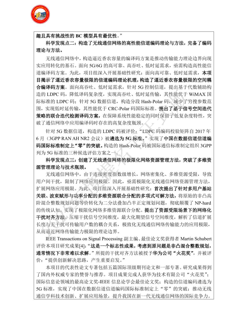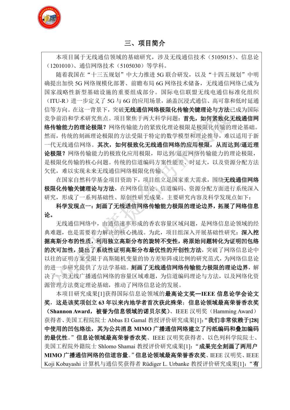 单位贡献:项目围绕无线通信网络极限化传输关键理论与方法开展深入系统的研究,拓展了网络信息论,完备了信道编码理论与方法,突破了极限化网络多维资源管理方法,为无线通信网络极限化传输提供了理论基础及技术保障,取得了一系列基础性、原创性的研究成果。相关研究成果发表在信息论顶级期刊IEEE Transactions on Information Theory,并获得信息论领域的最高论文奖—信息论学会论文奖;所构造的LDPC码入选3GPP 5G NR国际标准,实现了中国在数据信道信道编码国际标准制定上“零”的突破;所提出的Hash-Polar码也被3GPP列为三种候选评估方案之一;相关研究成果发表在通信领域顶级期刊IEEE Transactions on Wireless Communications及IEEE Transactions on Communications,提出的干扰管理方法获得华为公司“火花奖”。该项目研究成果获得了国内外权威专家的赞誉与推荐。