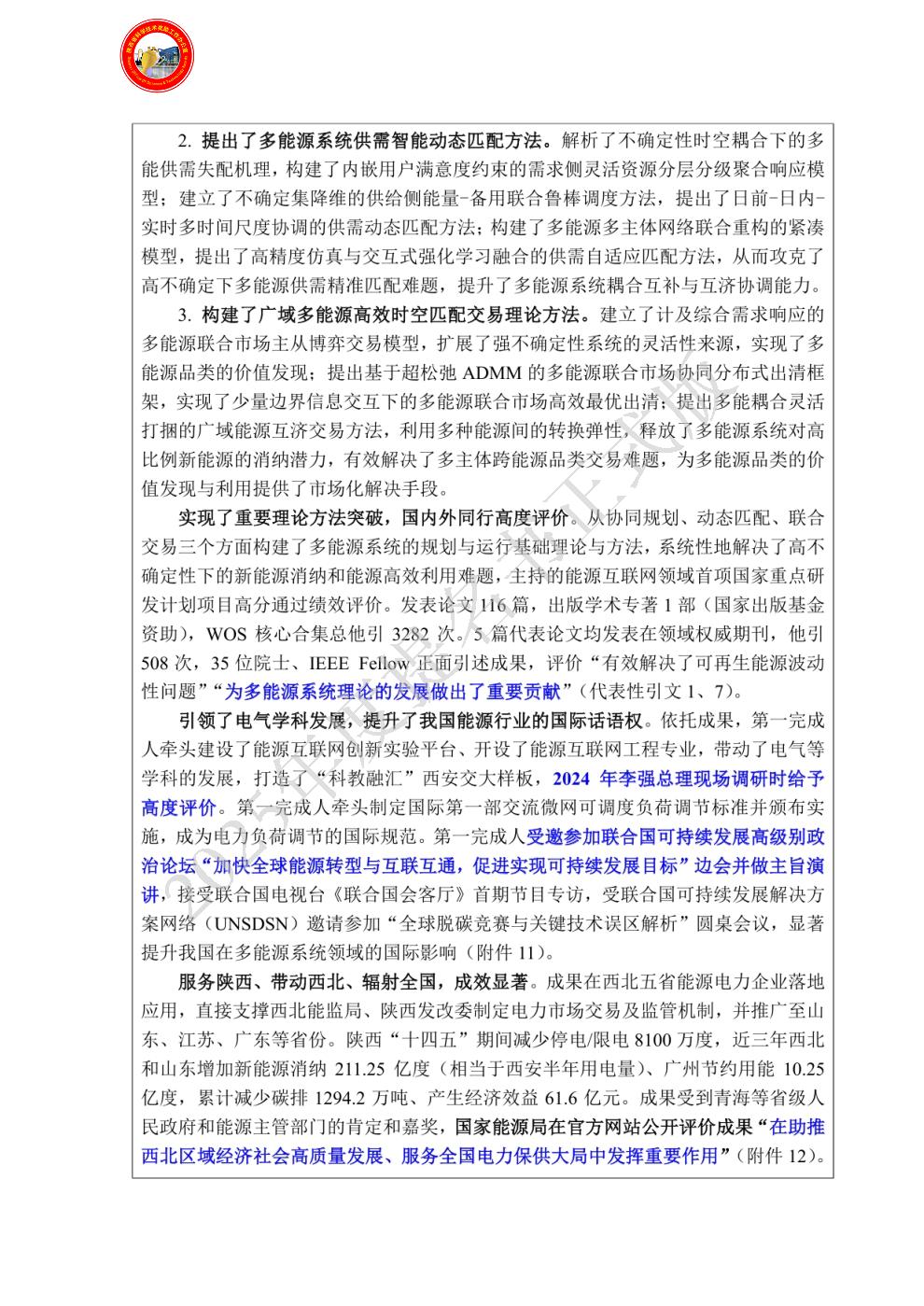 单位贡献:西安交通大学作为该项目的第一完成单位,是项目整体学术思想的发源地和主要研究平台。系统性地开展了高不确定性多能源系统协同规划与供需匹配的理论及方法研究,取得了系列原创性成果。主要研究贡献包括:(1)创建了高不确定性多能源系统协同规划理论与方法,提出了内嵌风险指标的概率性规划模型,解决了传统规划方法难以应对强不确定性的难题(发现点1)。(2)提出了高不确定性下多能源系统供需动态匹配方法,构建了基于鲁棒优化、人工智能等技术的智能决策模型,实现了复杂运行场景下的供需高效匹配与在线优化(发现点2)。(3)构建了多能源系统高效时空匹配交易理论,发明了“灵活打捆”与“电量库”两种新型交易机制,为解决清洁能源市场化消纳难题提供了关键理论支撑(发现点3)。该单位的系列研究成果在国际顶级期刊发表并被广泛引用,为我国构建新型能源体系提供了重要的理论基础。